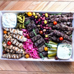 Tzatziki, mini beef and chicken souvlaki, spanakopita, hummus and Kalamata olives. Served with pita wedges.$119.99 (serves 20) -