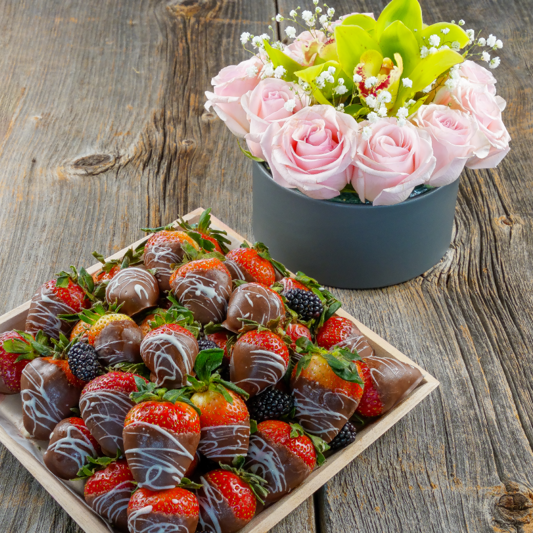 35pc chocolate dipped strawberry tray and a floral arrangement of 1 dozen fresh pink roses with orchids.