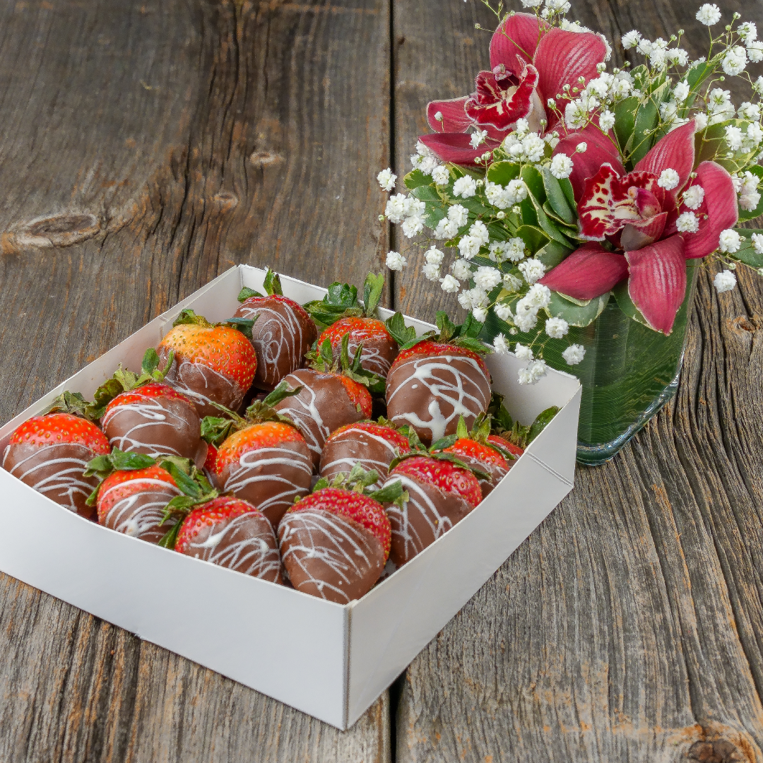 1 Dozen chocolate dipped strawberries and a floral arrangement of fresh orchids and baby’s breath.