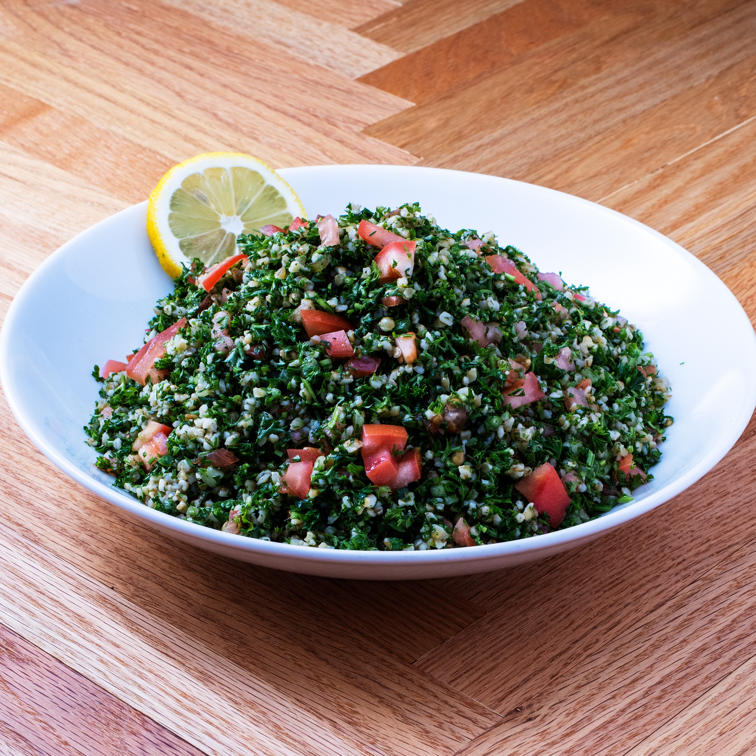 Parsley, tomato, cucumber, bulger, lemon juice, olive oil and seasonings.